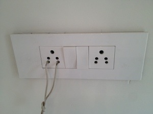 There were some workmen installing mosquito screens in the windows of my apartment during today’s walk-through of the apartment. This is how they plugged their electric drills into the wall sockets: