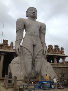 The site has been a holy place since 3rd Century BC, but the colossus was finished in 981AD. As I understand the story: Gomata and one of his brothers (the properly acknowledged hire) fought mightily over who would rule the kingdom. Even though he won, Gomata couldn’t bear hurting his brother, so he ended giving his brother the kingdom and went off to meditate. He stood still for so long in this yoga pose that ants built hills at his feet and vines started to grow on him. But he was still unsettled, since he was on what was now his brother’s land. One day his brother came by and acknowledged that the land was really his (Gomata’s) — in some versions it is said the brother actually returns the land– and in that moment Gomata attains enlightenment/Nirvana. (I am still a little blurry about which brother retained the property rights to the kingdom, but I suppose this doesn’t matter to someone who has attained Nirvana…)
