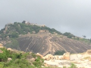 It’s very lovely – and quite the hike to scale the mountain to get to the top to view the statute. One must climb 641steps carved into the rock face. You can see the path winding up the mountain and glimpse Gomata standing serenely at the top (behind the big tree) from this photo: