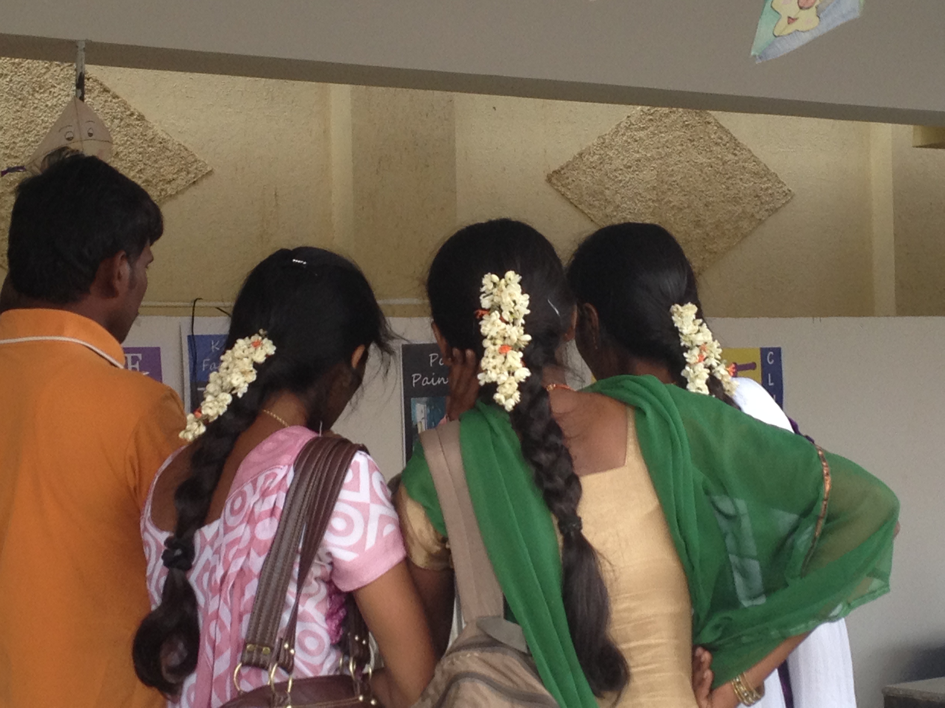 I am a fan of the simple white strings of jasmine. You buy them by the “hand” (a new and rather subjective unit of measure to me; it means the seller’s hand and not my super-sized American hand). They have been costing around 10, 15, or 20 rupees a hand <$0.40), depending on weather (cheaper after a thunder storm) and day (apparently they can be significantly more expensive on religious holidays).
