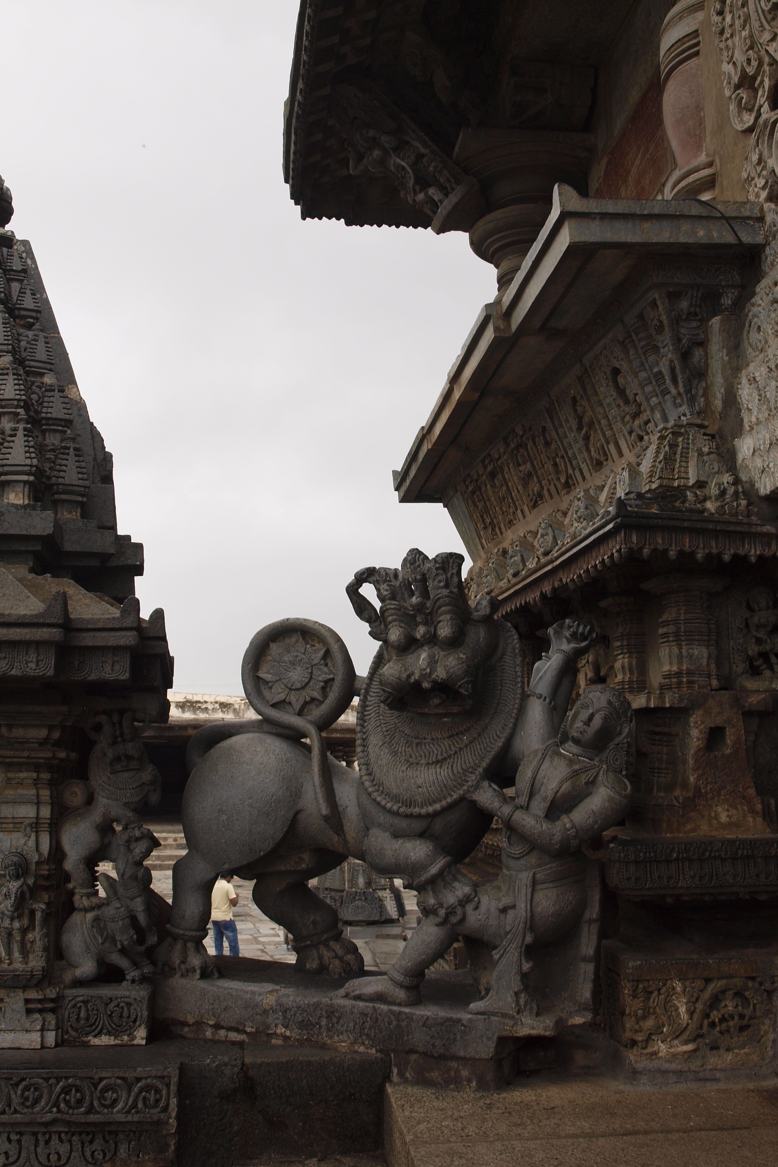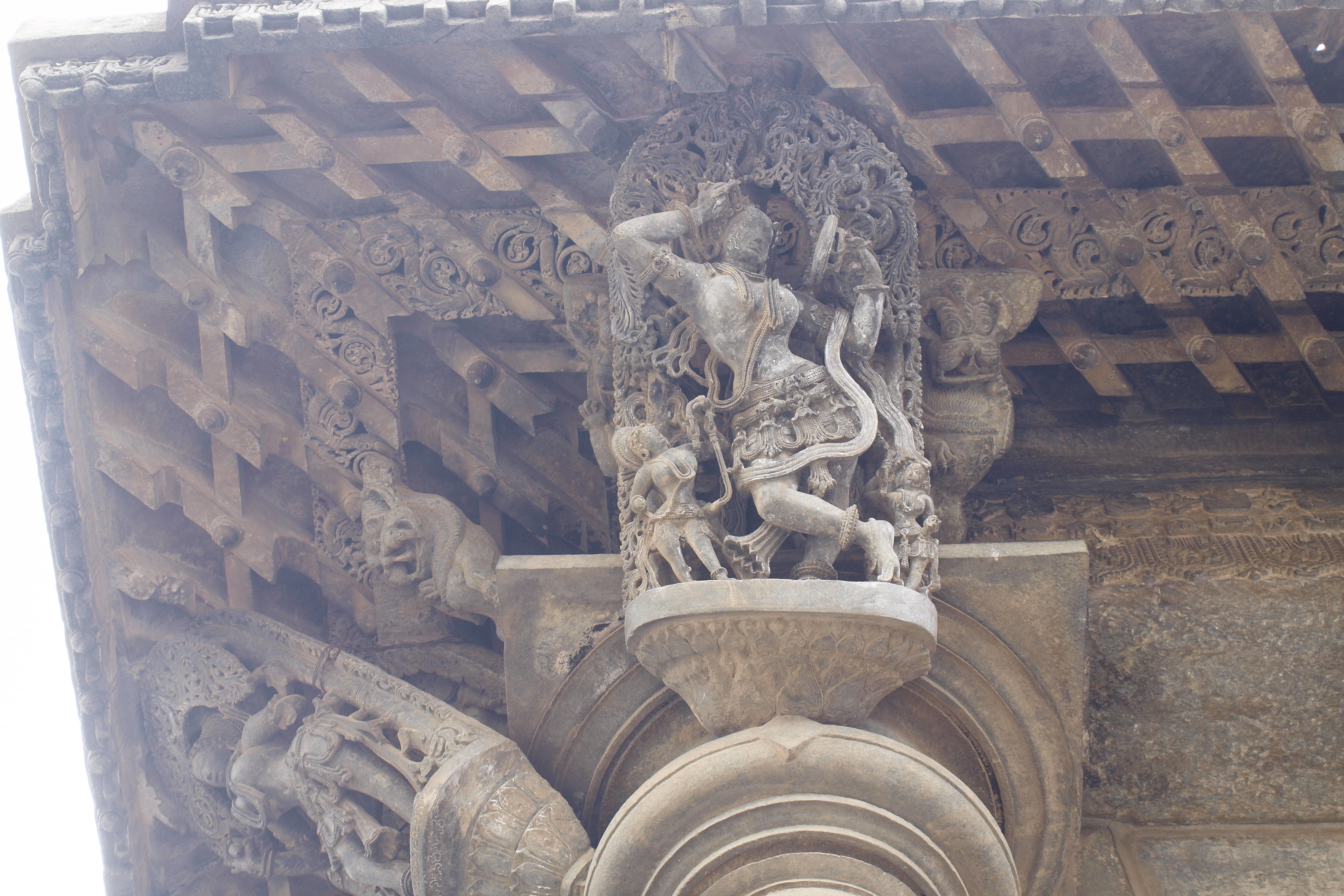 At the entrances, there are depictions of the “crest” of the Hoysala Kings: Sala (the first king) famously killing a tiger.