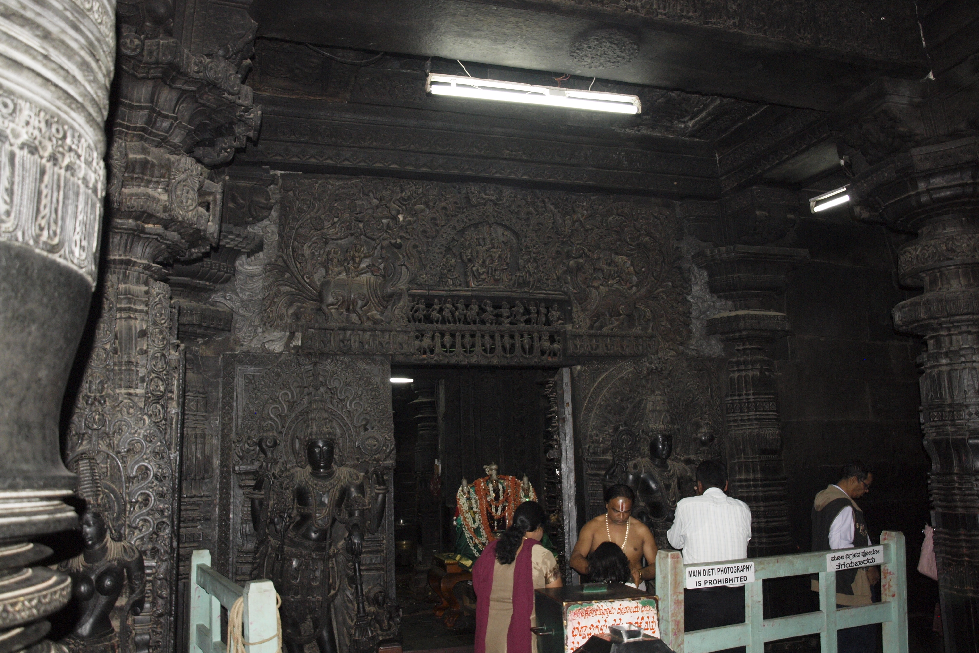 Inside there are more of the smooth, lantern shaped columns seen at other temples, as well as some really lacy ornate ones, too. The lotus-inspired ceiling is breath-taking. There is only one idol in the main temple, that of Keshava (one of Vishnu’s 24 forms) — but you are not allowed to photograph the main idol.