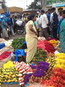 C was telling me about this festival and he cautioned me about the inevitable shortage of flowers that would result. As C predicted, the “Times of India” has reported a “soaring” demand for flowers and fruits. That City Market I visited last week, with the wholesalers, well it reportedly sold out of flowers — hard to imagine! And that despite the flower price gouging that is known to occur in the run up to festivals. The Jasmine I normally buy for Rs.10 a “hand” was being sold for Rs. 35! Needless to say, I am currently jasmine-less. I figured it mattered more to others this week so I opted out of the flower-buying insanity. Not to mention, the Gerber daises I got last Friday are still going strong (albeit never as fragrant as the Jasmine).