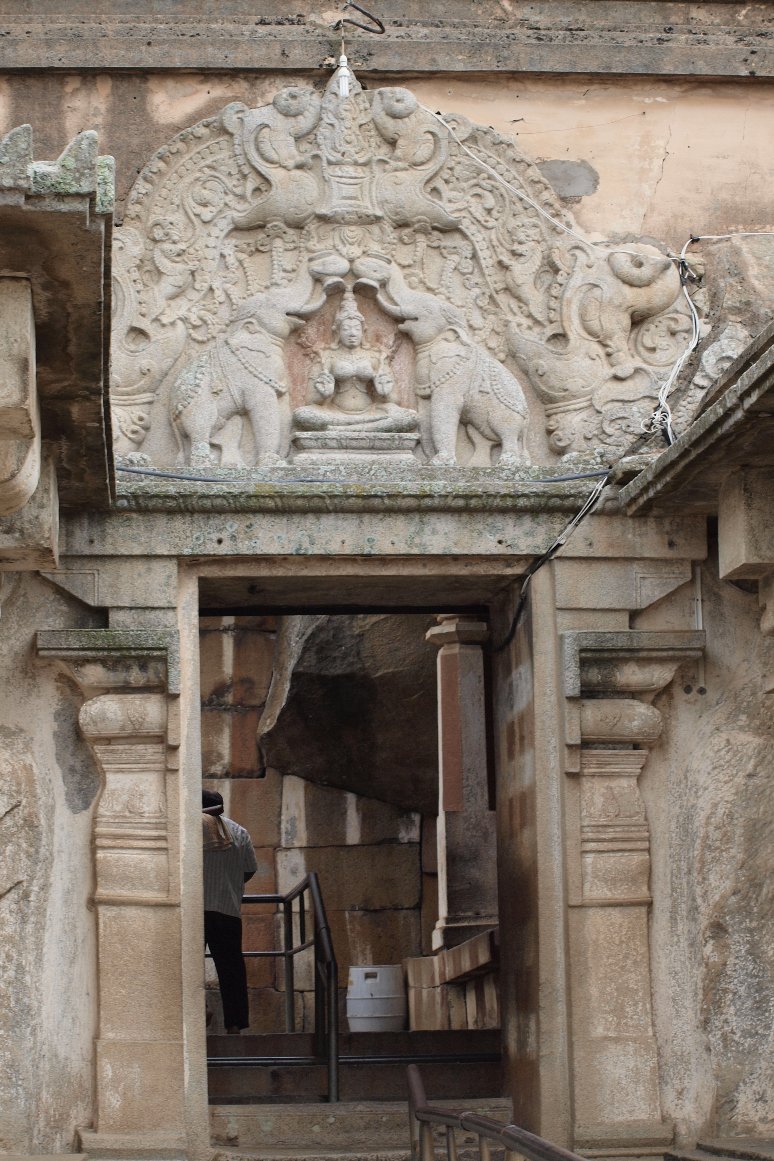 Here’s a relief of her between elephants, seated on a lotus, which I photographed at Gomatesvara: