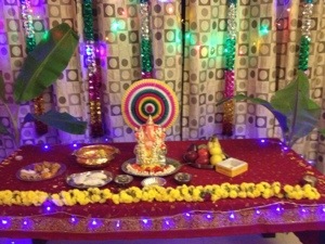 For his birthday, people make or buy clay figures of Ganesh and place them on an alter with sweets, fruit, flowers, fairy lights, etc. (Ganesh has a sweet tooth — he once ate so many sweets his tummy started to burst open, but he took a nearby snake to wear as belt to keep it together. Modak, sweet dumplings, were said to be his faves; I agree they are tasty!) After Ganesh sits on the alter for 1,3,5,7 or 11 days (I gather you can pick whatever suits your convenience), he is immersed in water. Often a bucket or tub at home (the water is then used in the garden) or a tank (man-made lake).