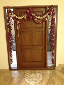 It’s a long holiday weekend here in India for festivals. Locally this weekend’s festival is known as Dussehra, and celebrates Goddess Durga’s (aka Chamundeshwari) victory over the demon Mahishasu. I decided to get into the spirit. I hung garland — obtained from City Market this morning (which is akin to saying I went Xmas shopping at Macy’s flagship on Xmas Eve. Total madhouse!). And tried my hand at my very first rangoli — the sand art in lieu of a door mat. It’s not the lovely, symmetrical rangoli I set out to make — clearly this takes years of practice and I am at about preschool level!