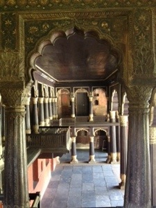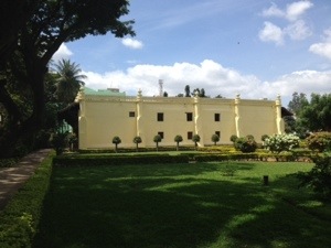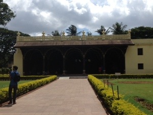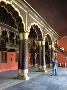 This is Tipu’s local palace, built inside the fortified city of Bangalore around 1791.The outside walls are masonry and the inside is wooden. It’s open air on 2 sides, with graceful fluted columns, and almost solid masonry on the other 2 sides, with small windows. It gives the appearance if being 1 story; however, once inside (out of the glare of sunlight), you can see a perfectly symmetrical mezzanine level, accessible by wooden stair cases in each corner. Some painted surfaces (ceilings, wall recesses) remain, so it’s easy to imagine it as it once was. There is a formal garden on one side and an adjacent temple. I really think Tipu had great taste in small palaces…